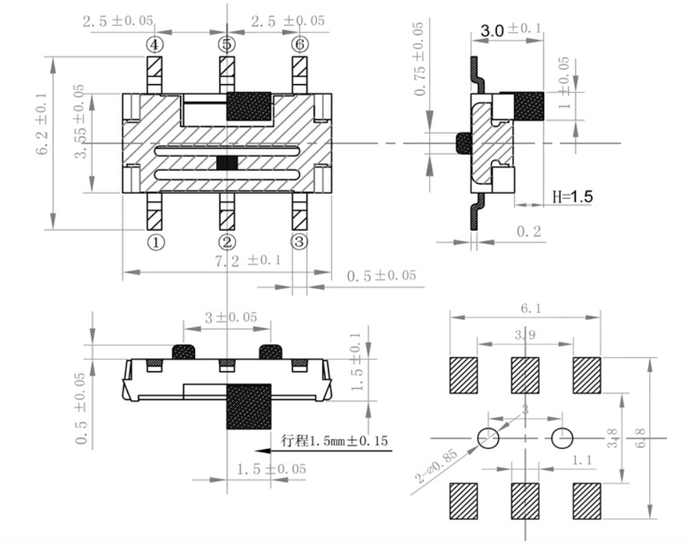 柄长1.5mm拨动开关6脚两档双排立式贴片滑动开关